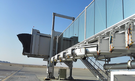 A380登機(jī)橋二層U1超高艙門而設(shè)計(jì)的登機(jī)橋,采用了行業(yè)內(nèi)首創(chuàng)的四輪驅(qū)動(dòng)行走機(jī)構(gòu)及其控制系統(tǒng)。
